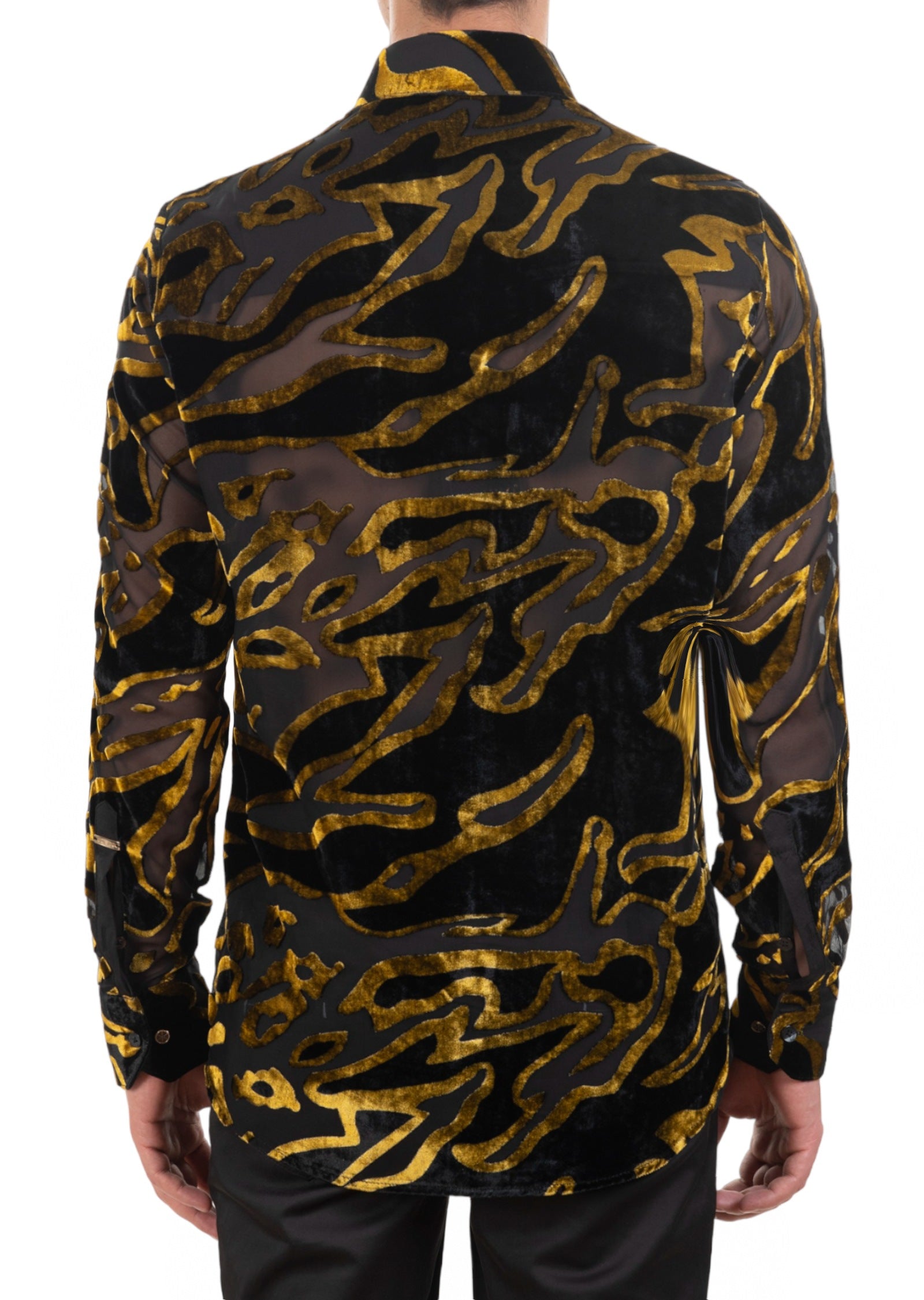 • Black gold abstract sheer design detailed velvet fabric. Add a plush and elegant touch to your going-out shirts with this shirt. With its hypnotic foil details, this velvet shirt is an irresistible choice for clubbing or date night