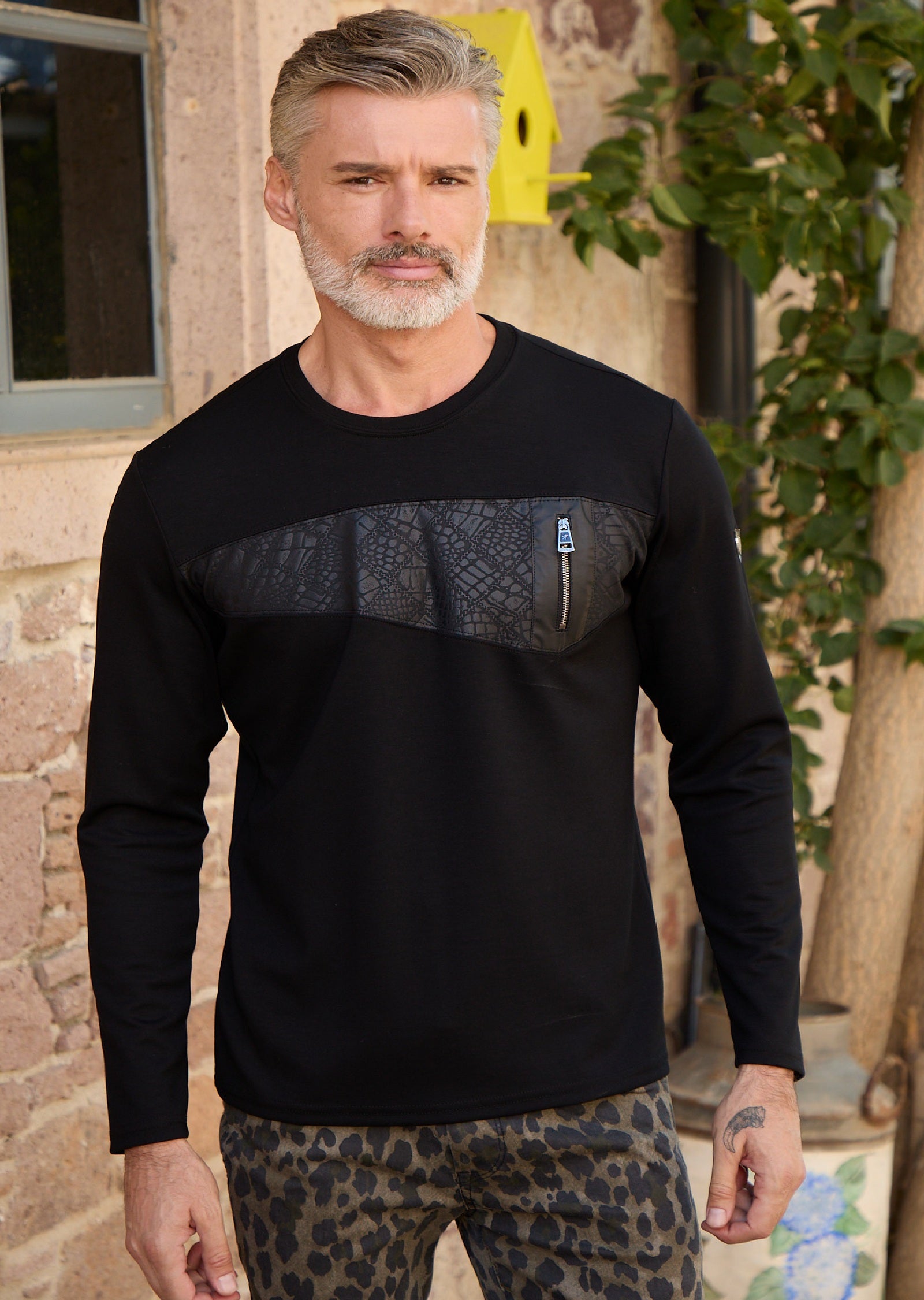Crew neck is constructed from a stretch knit with a soft and luxurious feel for all day