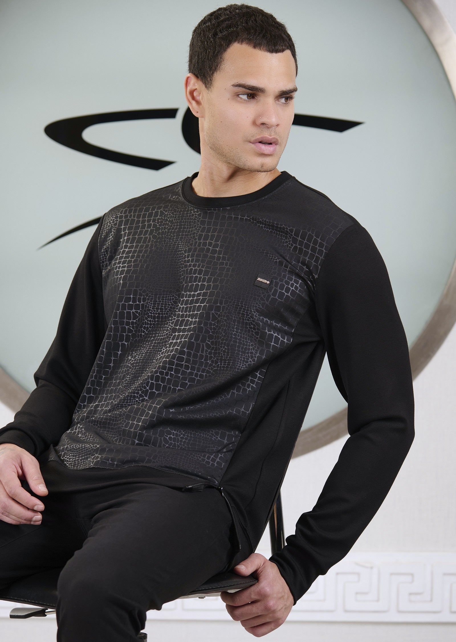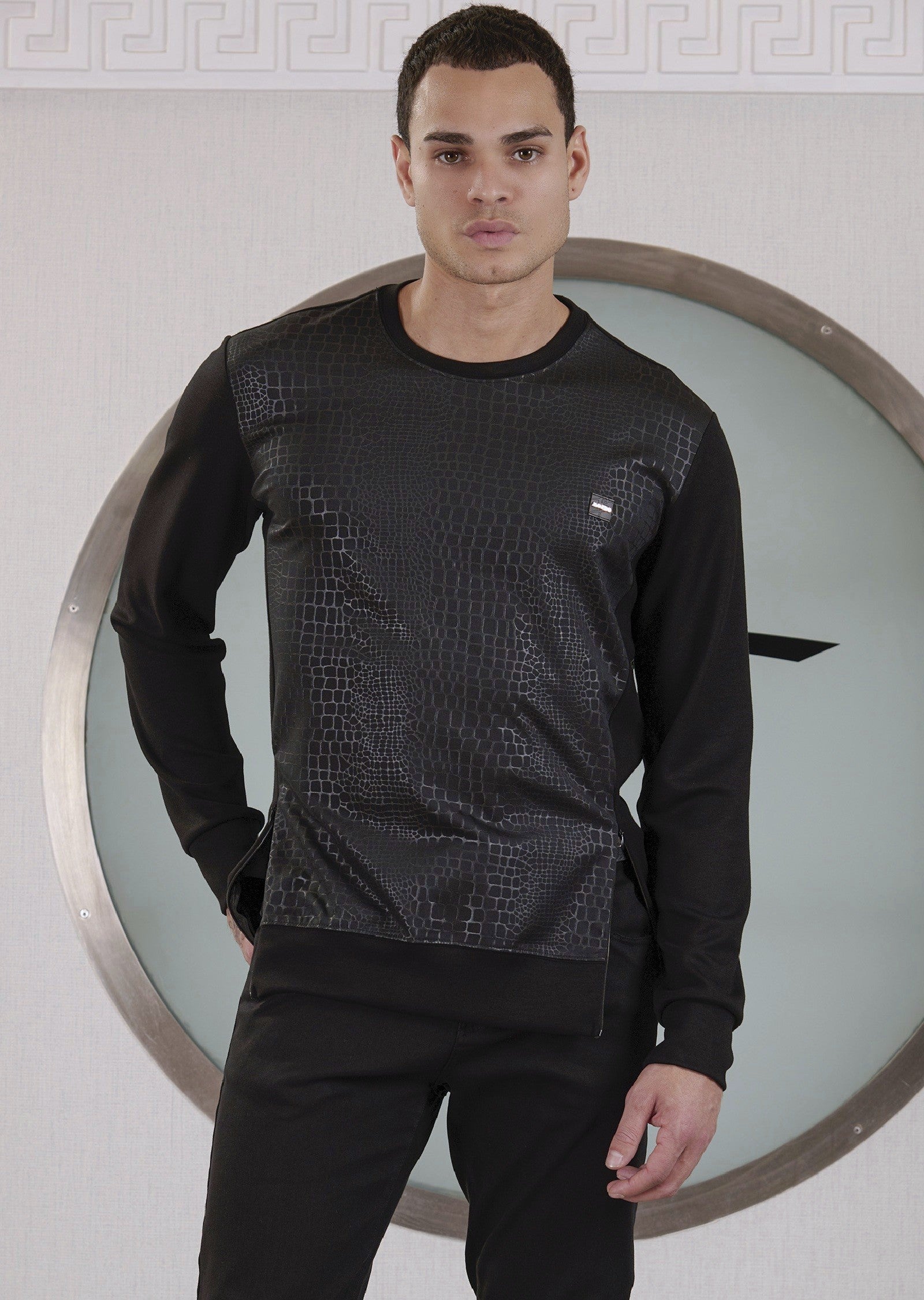 Double side zipper snake tech print with solid sleeve and back details