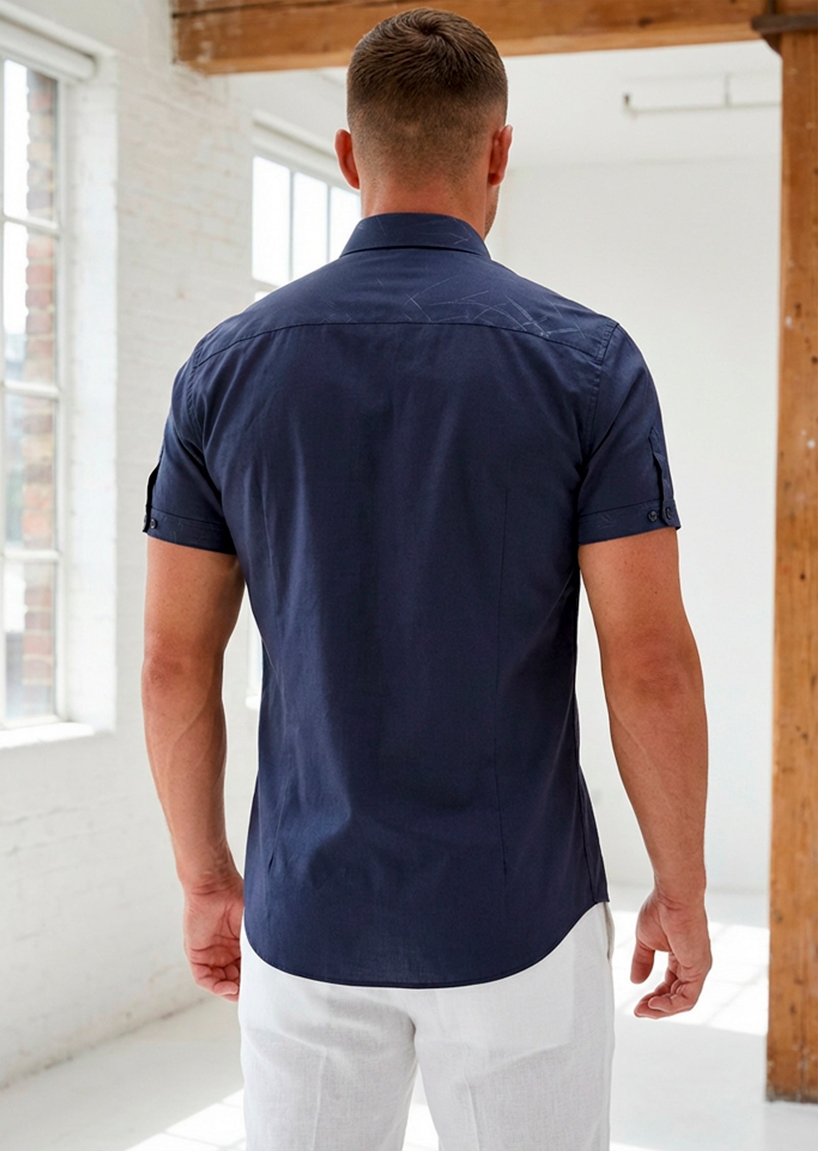 - Short sleeves with button cuffs