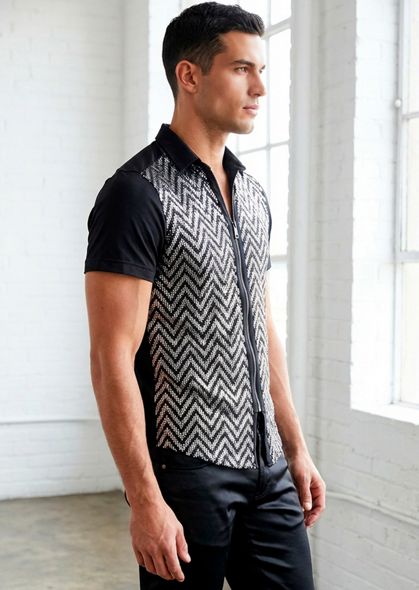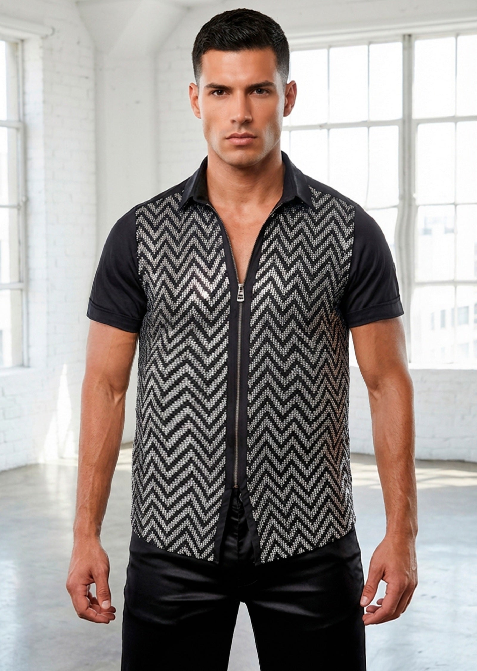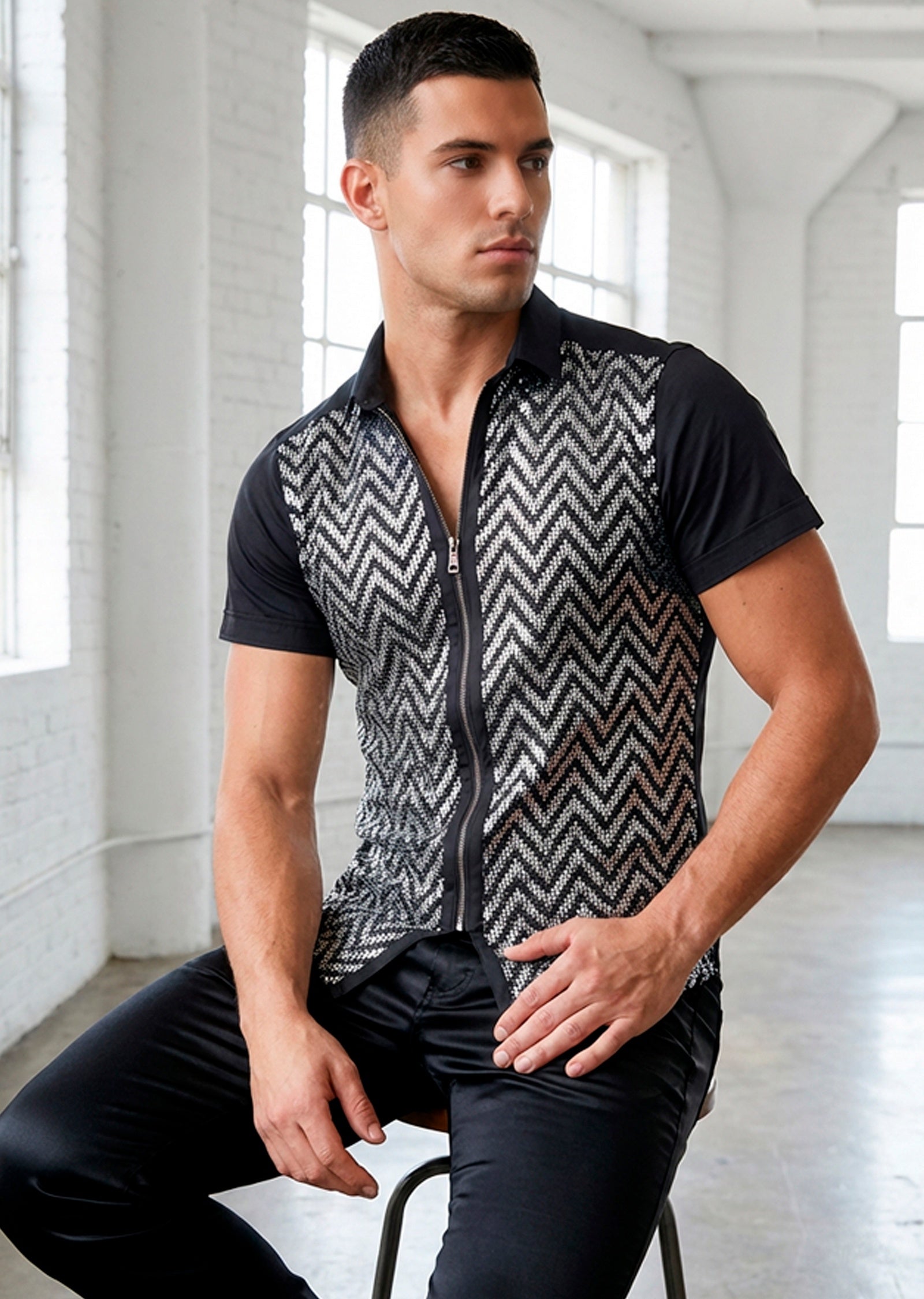 - Go for the black silver zigzag stretch sequined zipper shirt