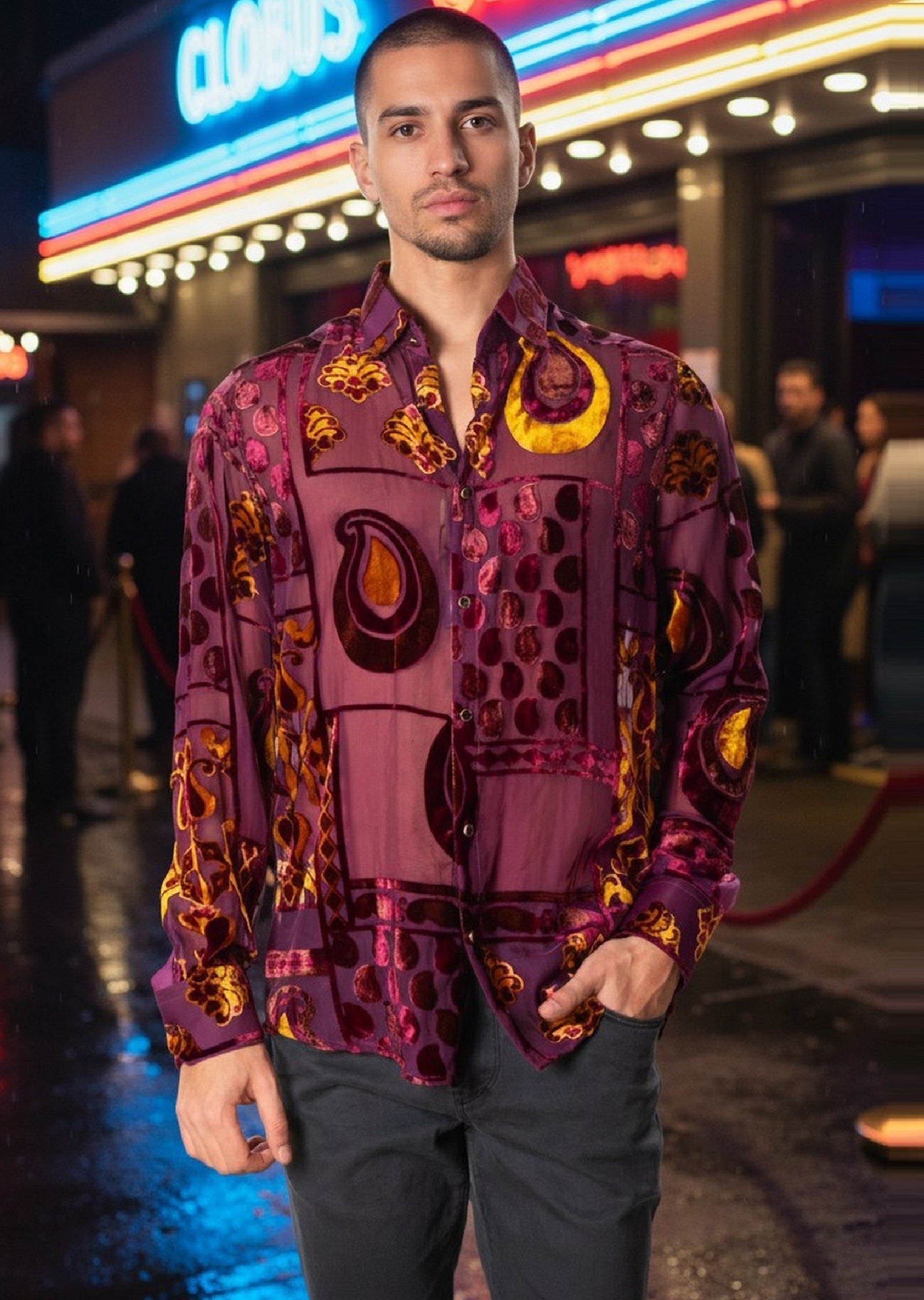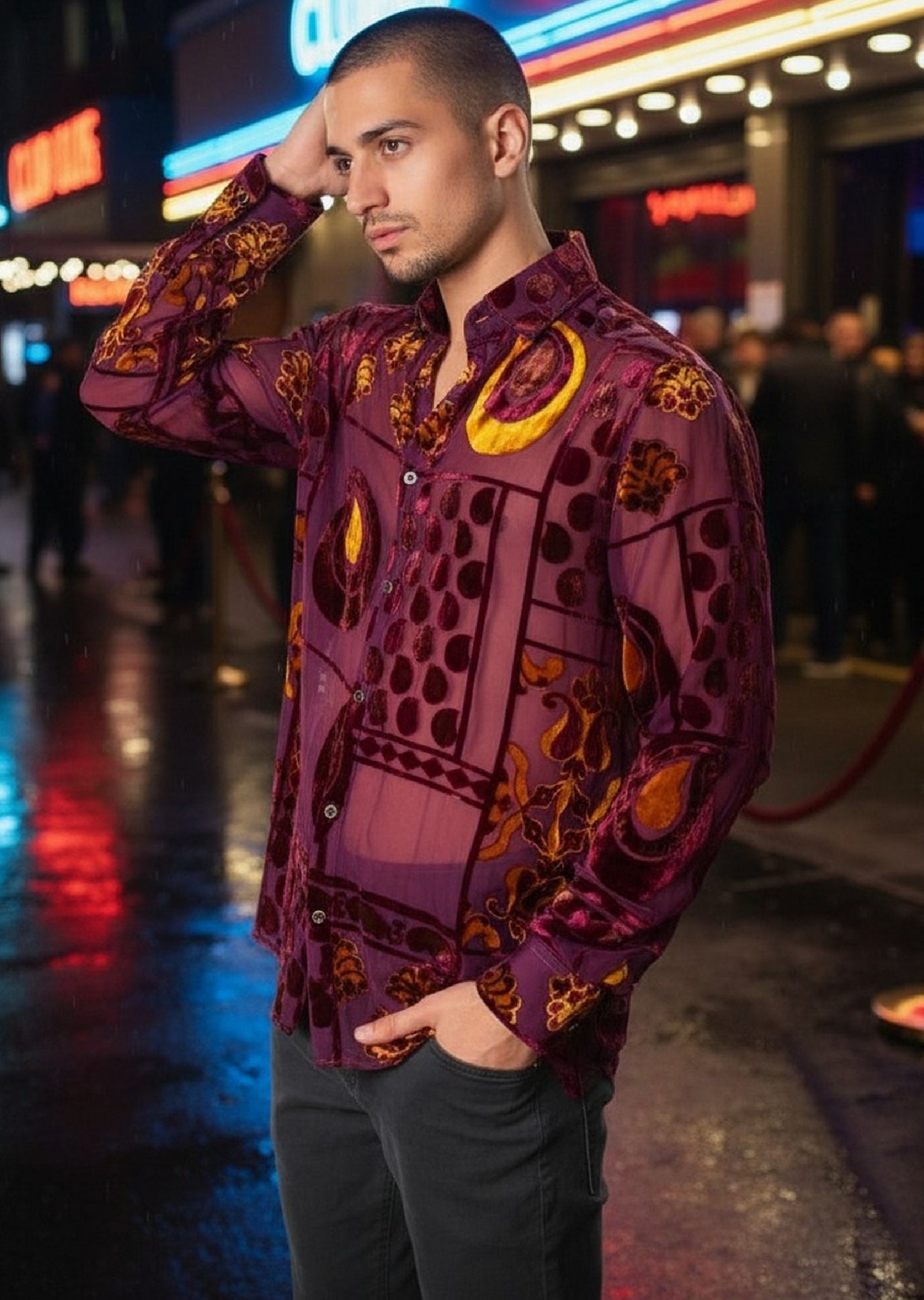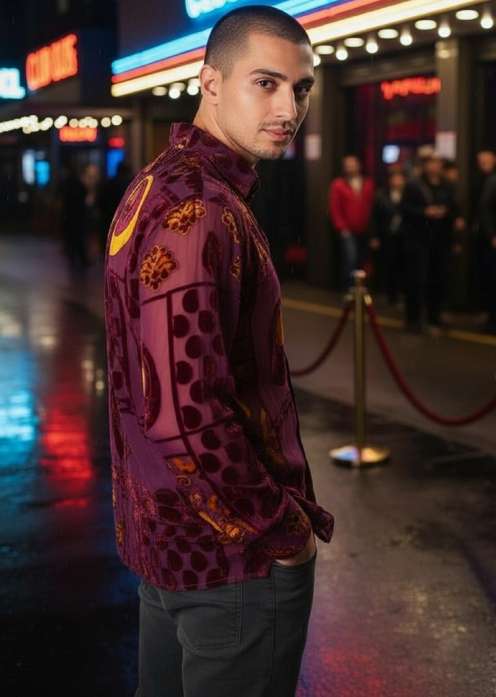 • Burgundy gold baroque sheer design detailed velvet fabric. Add a plush and elegant touch to your going-out shirts with this shirt. With its hypnotic foil details, this velvet shirt is an irresistible choice for clubbing or date night