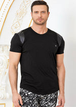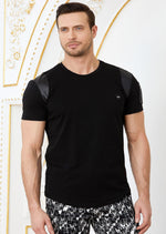 Black with black coated lycra fabric contrast on the both shoulder, finished with single arm zipper pocket. This style brings an opulent look to a stretch-cotton tshirt that's elegant on its own or layered under jacket or blazer